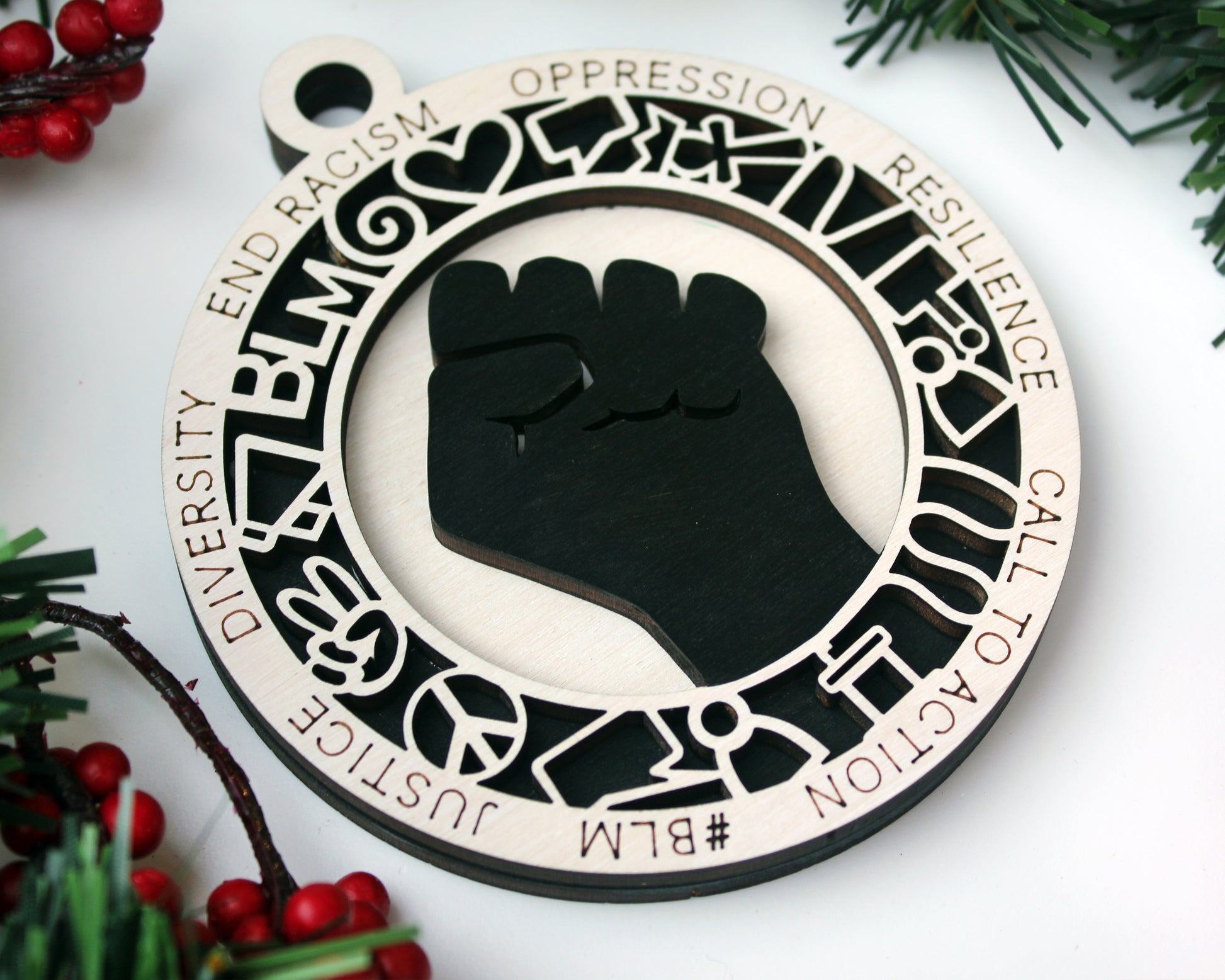 Decorative BLM Christmas Ornament – Intricate patterns, borders, or ornamental designs cut or engraved into wood for home décor, gifts, or event signage.